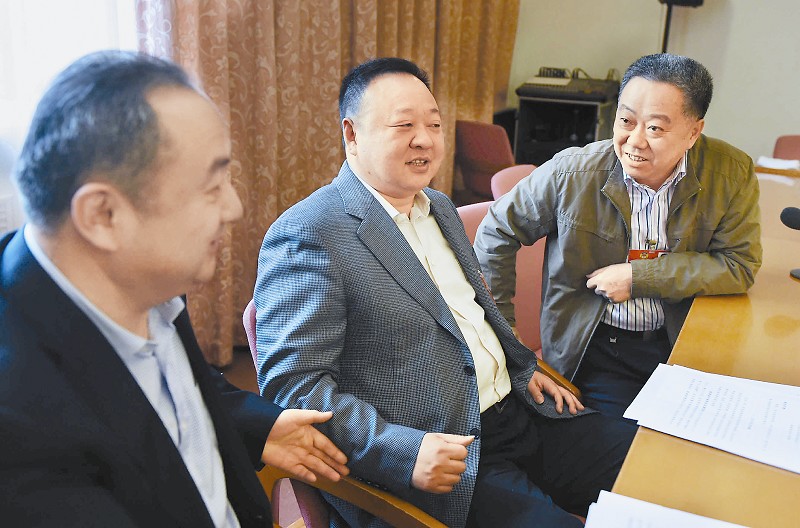 戴晓雁委员(右)找到贾殿赠委员(左),骆正明委员(中),就设立成都自贸区,推动西部大开发深入发展的建议,向他们征求意见。川报集团特派记者 田为 摄