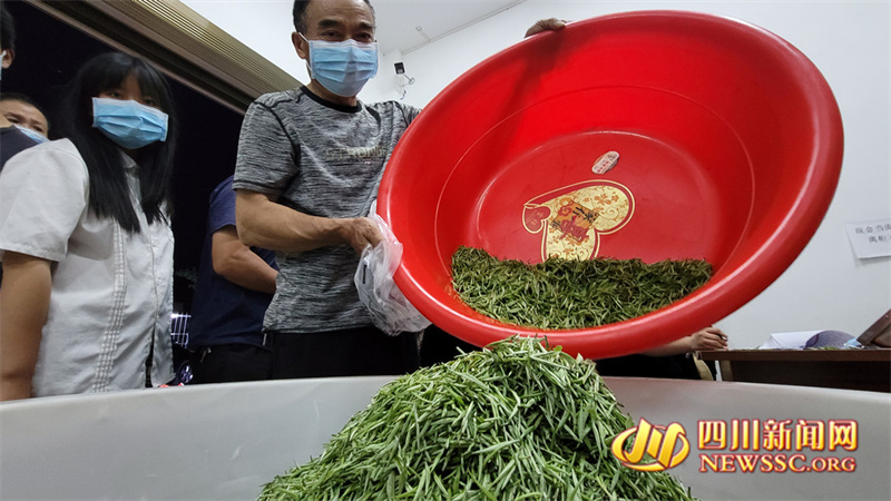 筠连县茶企收点,茶农拿着当天新鲜采摘的茶叶,排队交货