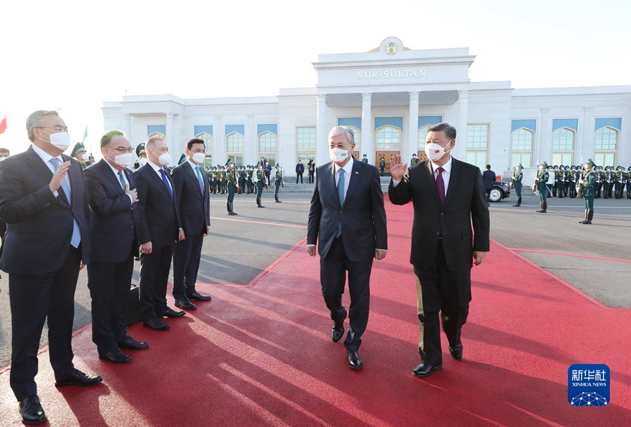 哈萨克斯坦总统托卡耶夫率政府副总理兼外长特列乌别尔季、努尔苏丹市市长库里吉诺夫等高级官员在机场热情迎接。70余名礼兵分列两侧致敬,军乐团奏迎宾号角。两名盛装哈萨克斯坦女青年手捧鲜花,表达对习近平主席的热烈欢迎。