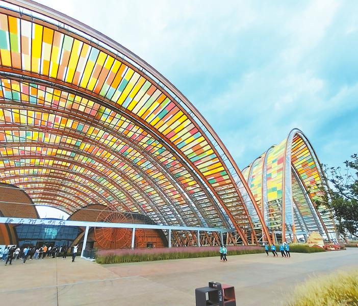顺着田坎走近天府农博岛,5座巨型木结构建筑映入眼帘,建筑顶部五颜六色,远远望去如稻浪翻涌起伏,这便是位于天府农博园核心区的天府农博·主展馆,它也是四季建筑地景“夏季稻浪”。整个主展馆占地202亩,建筑面积13.2万平方米,5座“稻浪式”建筑后面是川西风格建筑的“后街”。