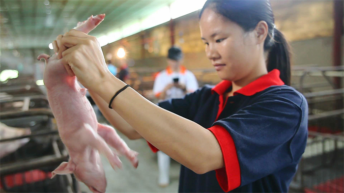 三台县明兴农业生猪养殖场内,工作人员正在给猪仔做检查。(刘玉明 供图)