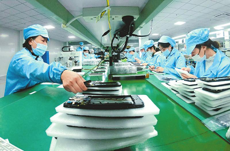 10月10日,在位于眉山的卓航电子科技有限公司,工人们正在生产线上赶制出口订单。潘建勇 摄(视觉四川)