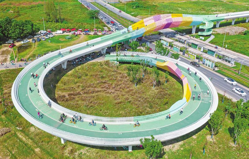 近日,成都市郫都区绕城高速外侧犀团路的“马卡龙”大桥上,不少市民游客正在骑行,感受生态公园之美。 四川日报全媒体记者 何海洋 摄