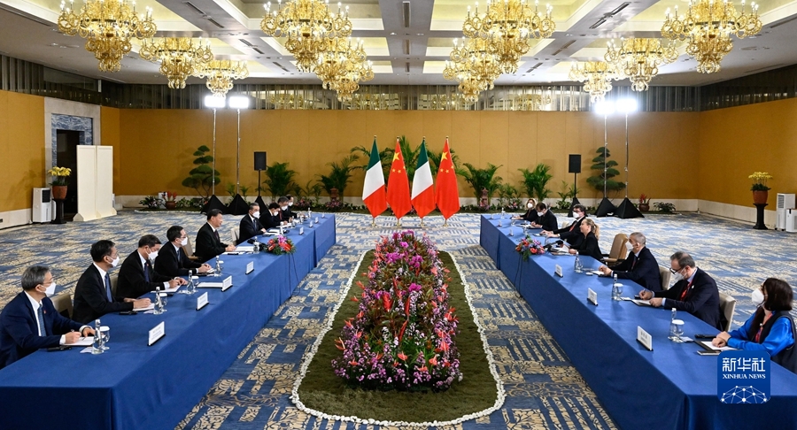 习近平指出,近年来,中意两国携手抗击新冠肺炎疫情,互办文化和旅游年,在华举办“意大利之源——古罗马文明展”,成为两国友好交往的生动见证。中意同为文明古国,互为全面战略伙伴,拥有广泛共同利益和深厚合作基础。双方应该传承和发扬友好传统,理解和支持彼此核心利益和重大关切,求同存异,扩大共识,为不同社会制度、不同文化背景国家发展关系树立表率。