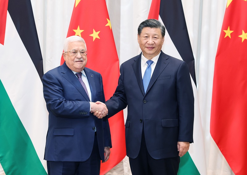 习近平指出,中巴友好深入人心。半个多世纪以来,双方始终相互信任,彼此支持。无论国际和地区形势如何变化,中方都坚定支持巴勒斯坦人民恢复民族合法权利的正义事业,始终同巴勒斯坦人民站在一起。国际社会应该把巴勒斯坦问题置于国际议程优先位置,坚持“两国方案”方向和“土地换和平”原则,在联合国有关决议和“阿拉伯和平倡议”基础上,推动重启和谈。中方将继续为推动巴勒斯坦问题早日得到公正持久解决不懈努力。