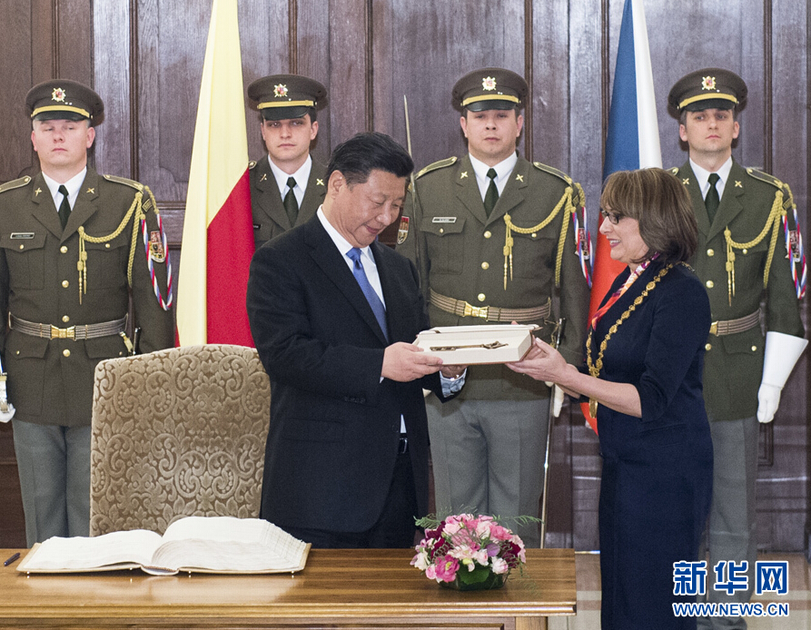 当地时间3月29日,国家主席习近平在捷克布拉格会见布拉格市长科尔娜乔娃,并接受科尔娜乔娃代表该市赠予的城市钥匙。 新华社记者 王晔 摄