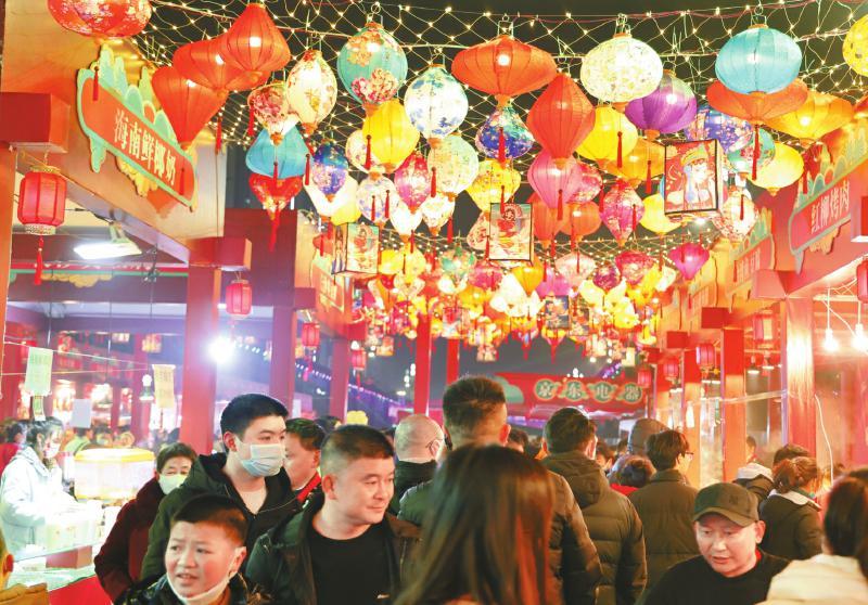 1月13日开幕式当晚,欢乐游园购物会一 开幕就吸引了上万名群众参与,猜灯谜、品美食、买年货……营造出春节欢乐喜庆的氛围。为增强消费者的沉浸式体验,百余名演员穿梭其间,他们或扮演小商贩,或扮演古代人物,不时停下来与游客互动。