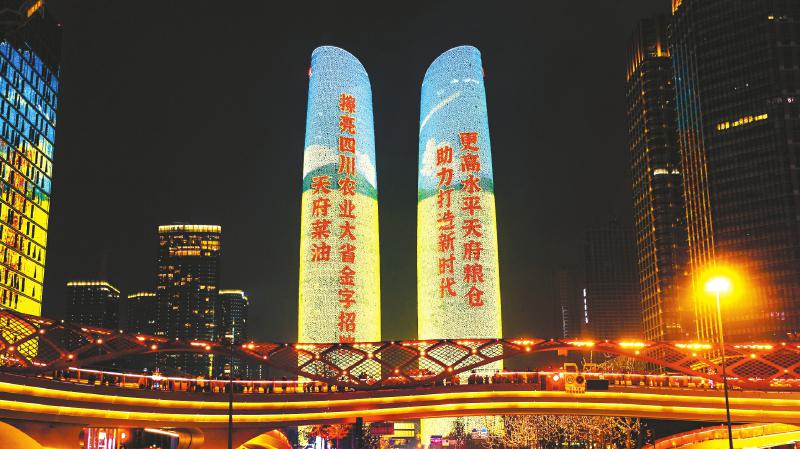 2023年1月1日,“天府菜油”亮相成都金融城双子塔。 四川国际品牌传播有限公司供图
