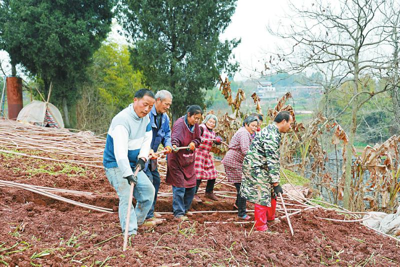 “走、走、走、走……”2月15日,记者来到内江市威远县新店镇民富村,嘹亮的吆喝声从小山坡顶传来。沿着小路走上山坡,只见村民李治芳在田埂边缘用锄头轻轻地翻开泥土,把露出的塑胶水管交给其他村民,大家一边吆喝着一边把埋在地里的水管拉扯出来。
