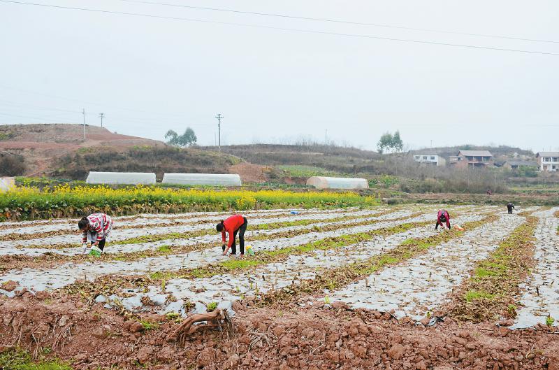 人勤春来早,播种正当时。2月15日,自贡市荣县乐德镇天宫庙村,红土地上覆盖了一层地膜,远远望去,像铺上了一层白雪。村民们拿起小铁锹在地膜上挖出一个个窝子,把一粒粒黄豆种精准“投”下去……