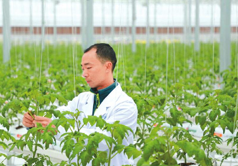 近日,沙湾区粮蔬现代农业产业园的智能大棚内,工作人员在检查小苗的长势。高懿 摄