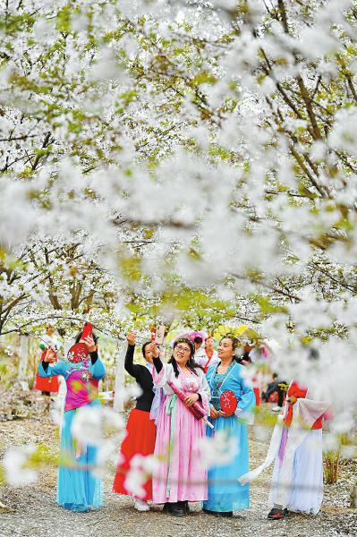 3月21日,游客们在“吴家染坊”附近的樱花林中打卡。
