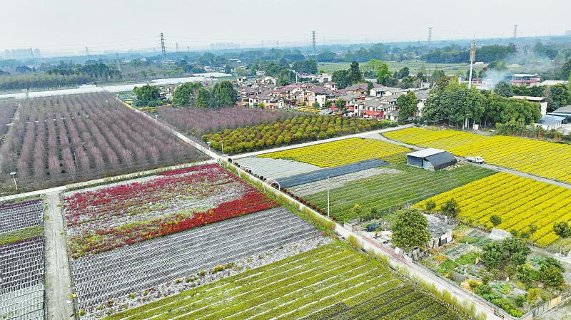 3月21日,远眺彭镇鲢鱼社区,社区周围种满了各种经济花卉和植物。
