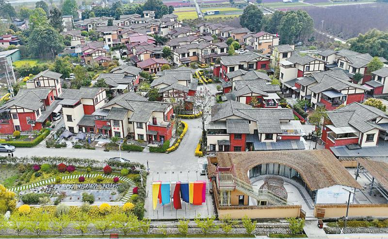 3月21日,鸟瞰彭镇鲢鱼社区,这里独栋民居林立,花香四溢,草木环绕。