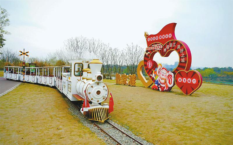 小火车上,欣赏金马河畔鲜花盛开……一到周末,温江区和盛镇就成了周边市民游客出行的热门之地。