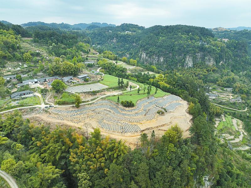 “金银花喜阳耐旱,经济价值高,苗子只要活了,就‘一劳永逸’了!”4月11日,内江市威远县越溪镇俩母山村,站在半山腰的梯田里,村民范中权正指挥挖掘机挖蓄水池,为栽下不久的金银花储备灌溉用水。