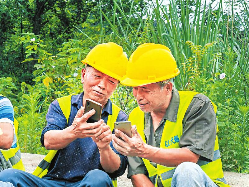 南充市嘉陵区参加以工代赈项目建设的群众正在查看劳务报酬。南充市嘉陵区发展和改革局供图