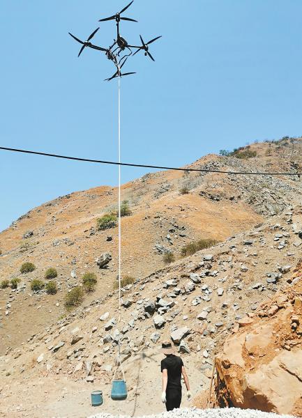 无人机运送混凝土、砂石。 彭莉 摄