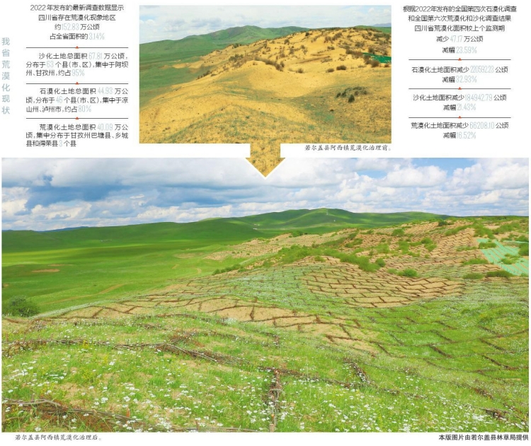 目前,四川荒漠化主要表现为沙化土地、石漠化土地和荒漠化土地,有分布广、区域化危害等特点。2007年,四川启动省级防沙治沙试点工程,省级财政连续16年专项支持川西北沙化土地治理。