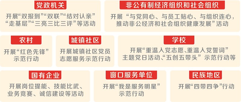根据要求,在“两学一做”学习教育中,党政机关要突出走在前头、作出表率要求,重点促进党员模范履行岗位职责和落实直接联系服务群众制度,开展“双报到”“双联”“结对认亲”“走基层”“三亮三比三评”(亮标准、亮身份、亮承诺,比技能、比作风、比业绩,群众评议、党员互评、领导点评)等活动,着力解决党员理想信念不坚定、看齐意识不强、不敢担当作为、表率作用不突出等问题,更好地为推动改革发展稳定凝聚共识和力量,以奋发有为的精神状态推进全省各项事业发展。