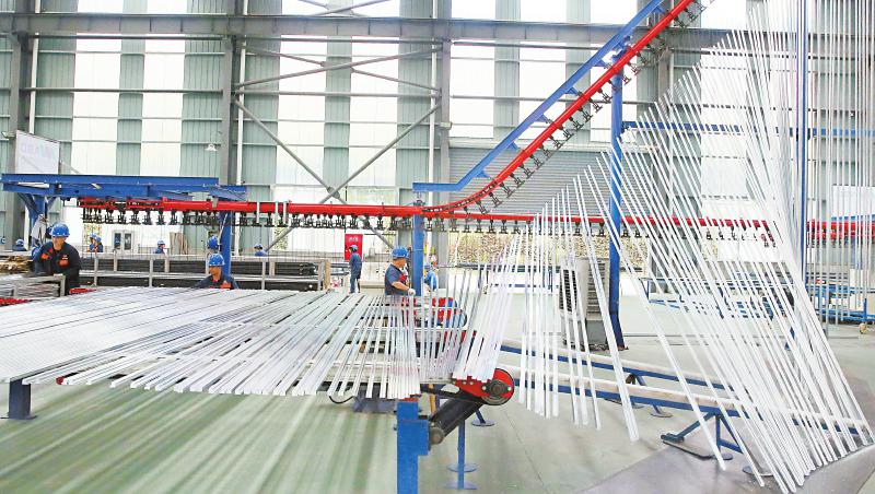 铝锭贸易中心可为铝工业企业提供充足的铝锭原料,助力铝企业发展生产。图为广元市国盛环保科技有限公司生产车间,工人正在生产铝材。 唐彪 摄