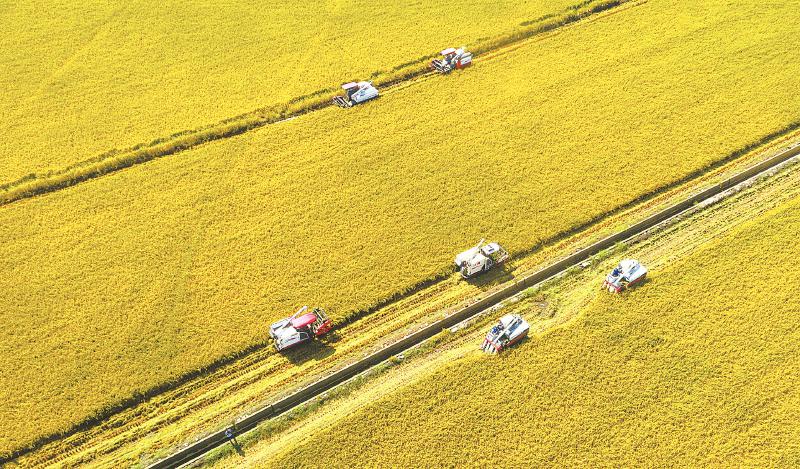 广汉市粮食基地水稻收获场景。