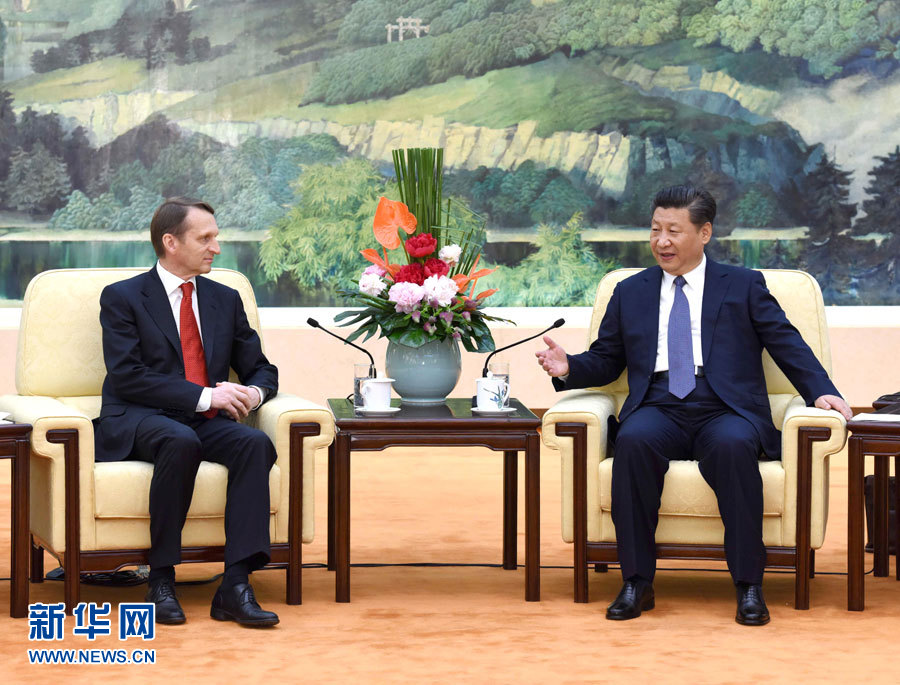 习近平首先请纳雷什金转达对普京总统的诚挚问候。他说,中俄全面战略协作伙伴关系的高水平发展符合两国人民共同愿望,顺应两国发展振兴需要,合乎世界和平、发展、合作、共赢的历史潮流。我同普京总统达成共识,下一阶段发展中俄关系的中心任务,是把两国高水平的政治关系优势转化为更多务实合作和国际合作成果,更好地造福两国和两国人民。今年是《中俄睦邻友好合作条约》签署15周年。希望双方以此为契机,大力弘扬条约确立的世代友好理念,为两国关系长期健康稳定发展奠定更加坚实的社会和民意基础。