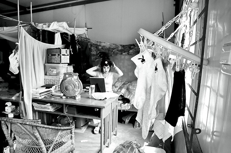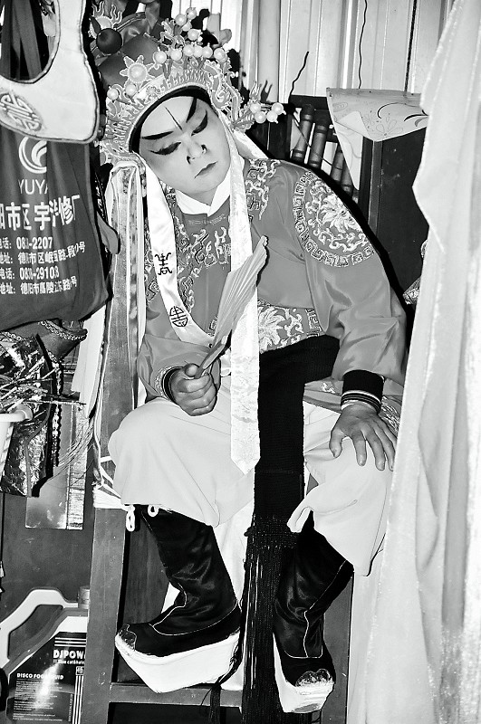 ④①台上在表演,台下坐着稀稀拉拉的老年观众。②每天下午2点,由姊妹花川剧团带来的川剧表演在福音堂准时开演。③还未上台演出的表演者在幕后抓紧间隙打盹儿。④5月5日中午1时许,姊妹花川剧团团员康蓉正在自己的宿舍内化妆准备。她所住的宿舍,也是紧挨着福音堂的临时板房。