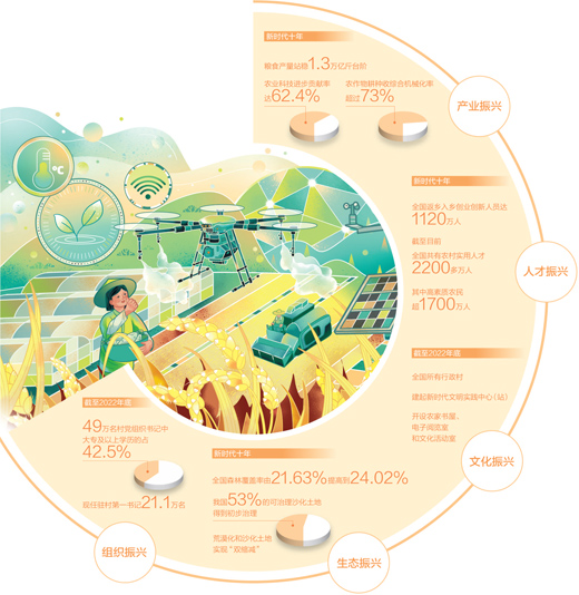民族要复兴,乡村必振兴。党的十八大以来,我国农业农村发展取得历史性成就、发生历史性变革。今年是全面贯彻落实党的二十大精神的开局之年,是全面推进乡村振兴、建设农业强国、推进农业农村现代化的关键之年。各地区各部门扛稳粮食安全责任,一体化推进农业农村现代化,农业高质高效、乡村宜居宜业、农民富裕富足迈上新台阶,全面推进乡村振兴取得可喜进展。