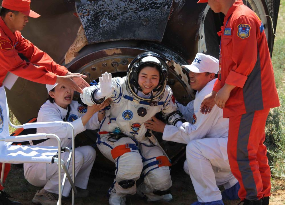 神舟九号飞船返回舱成功降落在位于内蒙古中部的主着陆场预定区域,航天员刘洋安全出舱(2012年6月29日摄)。新华社记者 王建民 摄