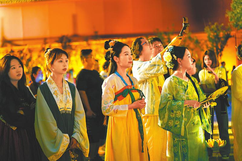 古色古香的文庙与“国潮”主题有着天然的亲近感。把握潮流趋势,德阳在“双节”期间举办古风汉服巡游、朝代汉服走秀、古舞古乐演绎、历代中秋变迁演绎等多项传统文化活动,吸引了各地的汉服爱好者。对弈、投壶、祈福、书法、点茶、飞花令等传统游园项目更是受到广大游客的一致好评。