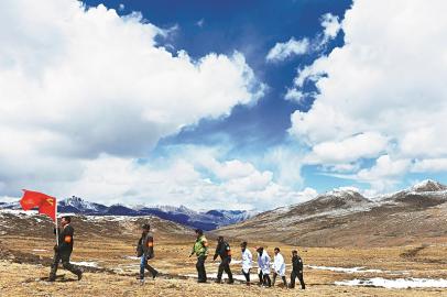 海拔5100米的高原上,理塘县拉波片区的党员服务队成员在山上巡逻,随时为群众服务。
