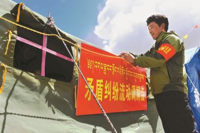 党员服务队成员在理塘县拉波片区采集点搭建“矛盾纠纷流动调解点”。