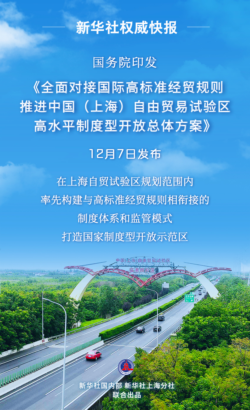 新华社北京12月7日电 国务院日前印发《全面对接国际高标准经贸规则推进中国(上海)自由贸易试验区高水平制度型开放总体方案》(以下简称《总体方案》)。《总体方案》以习近平新时代中国特色社会主义思想为指导,全面贯彻落实党的二十大精神,稳步扩大规则、规制、管理、标准等制度型开放,在上海自贸试验区规划范围内,率先构建与高标准经贸规则相衔接的制度体系和监管模式,打造国家制度型开放示范区,为全面深化改革和扩大开放探索新路径、积累新经验。