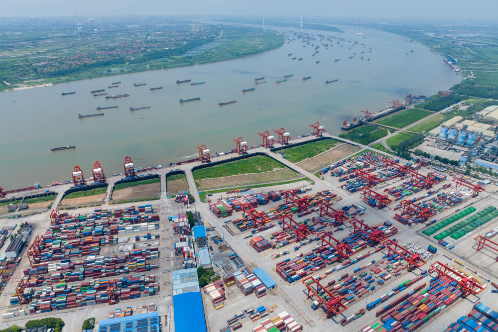 武汉阳逻港一期码头(2023年7月5日摄,无人机照片)。新华社记者 伍志尊 摄