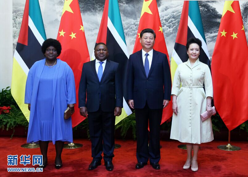 5月18日,国家主席习近平在北京人民大会堂同莫桑比克总统纽西举行会谈。会谈前,习近平为纽西总统举行欢迎仪式。这是习近平和夫人彭丽媛在人民大会堂同纽西总统夫妇合影。新华社记者姚大伟摄