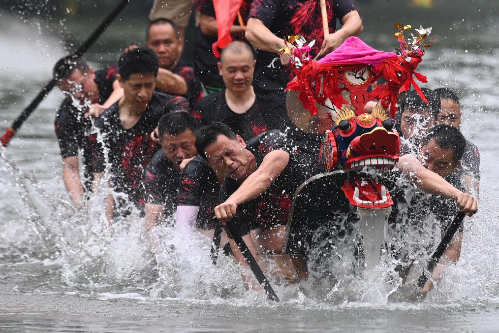 2023年6月22日,农历五月初五,中国传统节日端午节,村民在杭州西溪国家湿地公园的蒋村龙舟胜会上划龙舟。蒋村龙舟胜会于2011年被列入国家级非物质文化遗产名录。新华社记者 黄宗治 摄