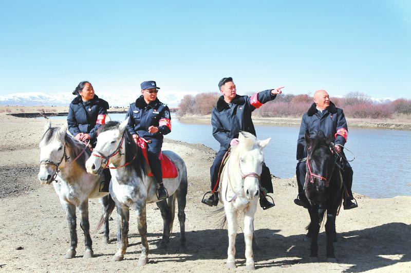 “鹤翔兰萨·九曲清”公益诉讼巡逻队在若尔盖县唐克镇黄河沿线开展巡河工作。