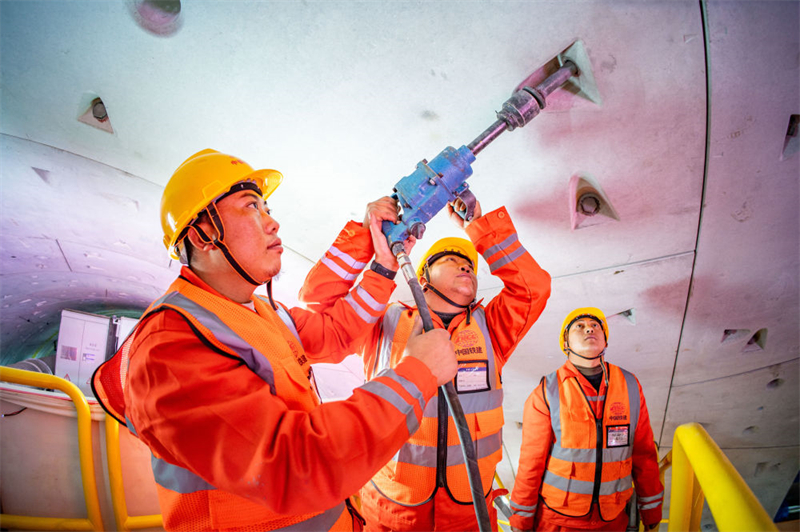 在中铁十四局京唐城际铁路运潮减河隧道内,施工人员在拼装管片(2024年2月4日摄)。新华社发(中铁十四局供图)