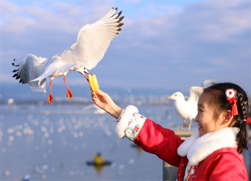 游客在昆明滇池边投喂红嘴鸥(2024年1月17日摄)。新华社发(刘元嵩摄)