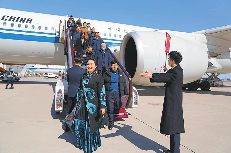 3月3日11时15分许,出席十四届全国人大二次会议的四川代表团代表乘机抵达北京首都机场。 四川日报全媒体记者 李强 摄