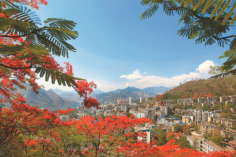 5月,省内最大规模的凤凰树花海正在攀枝花市东区凤凰花公园内灿烂盛开,吸引着大批游客。一排排凤凰树迎风招展,红宝石般的花团,点缀在翠玉般的枝叶上,绚烂而温暖,是攀枝花这座城市独有的风景。